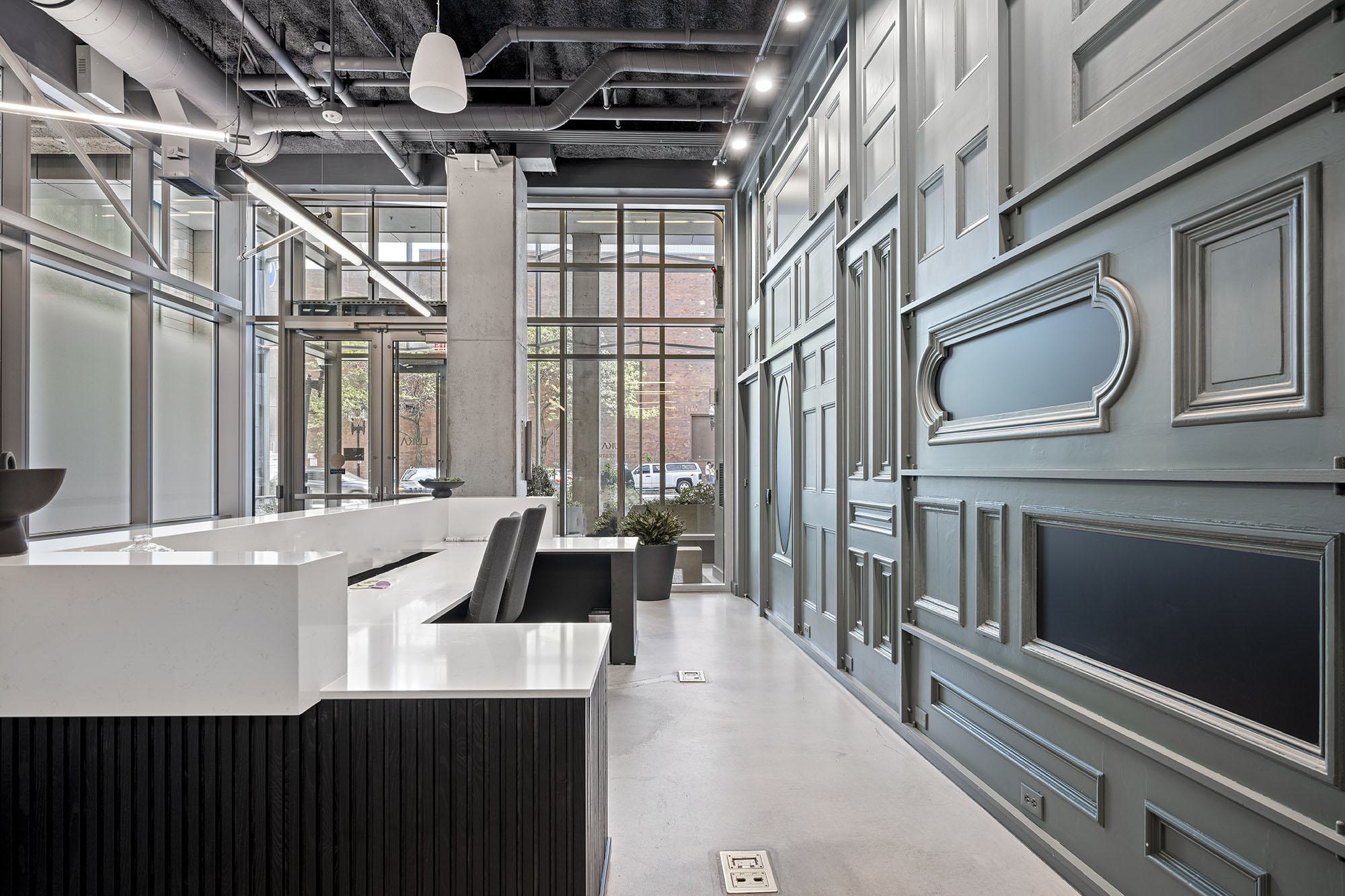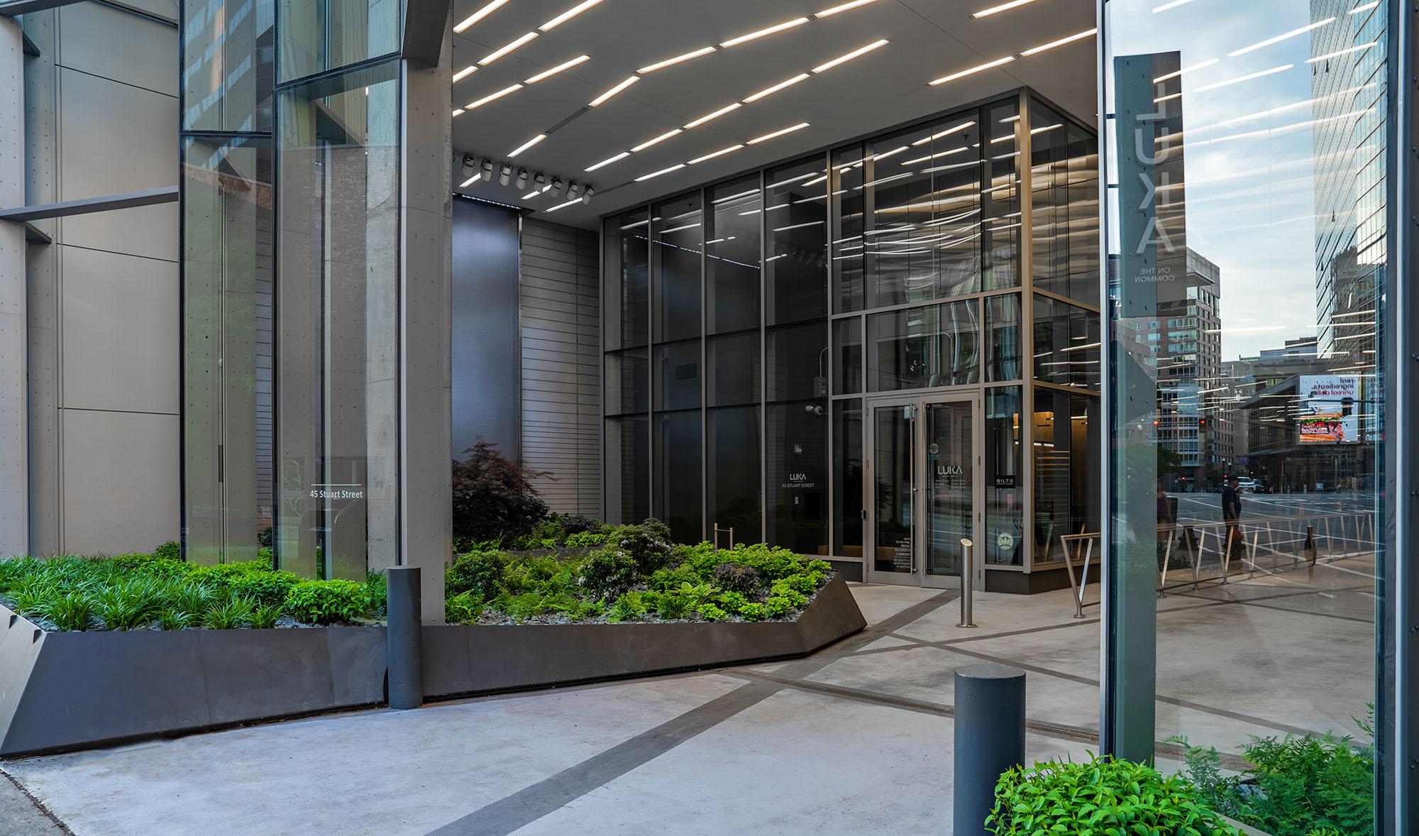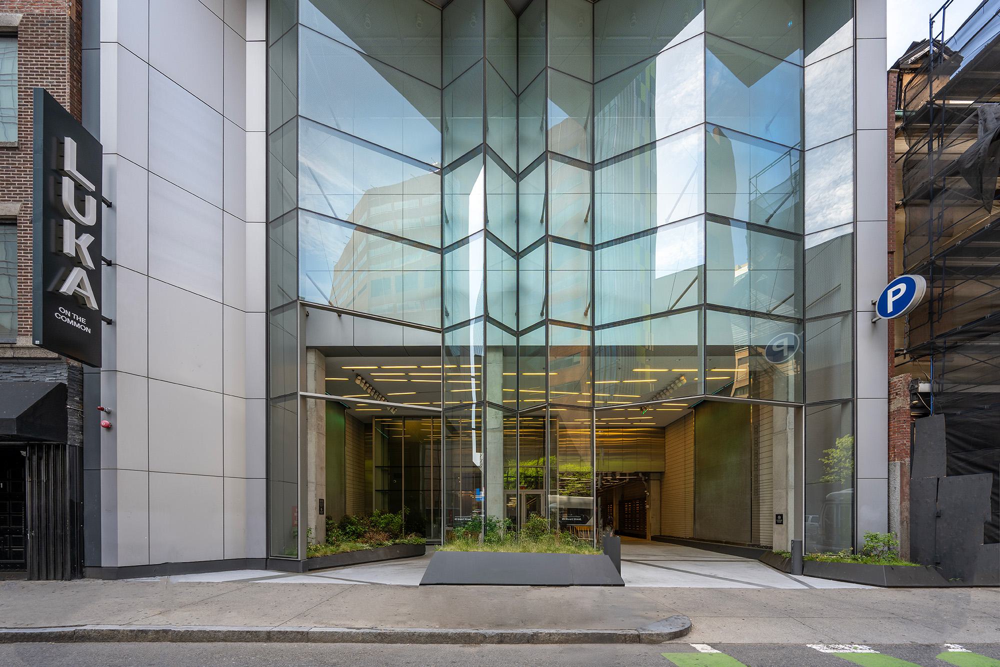 Luka's striking glass-paneled building entrance near Boston Common